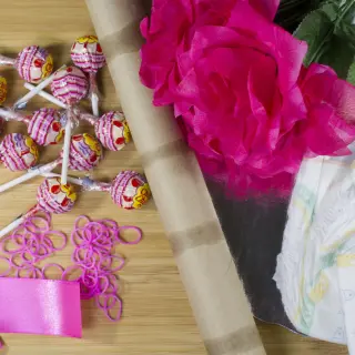 Coloca los pañales alrededor del tubo de cartón y asegúralos usando el listón delgado.