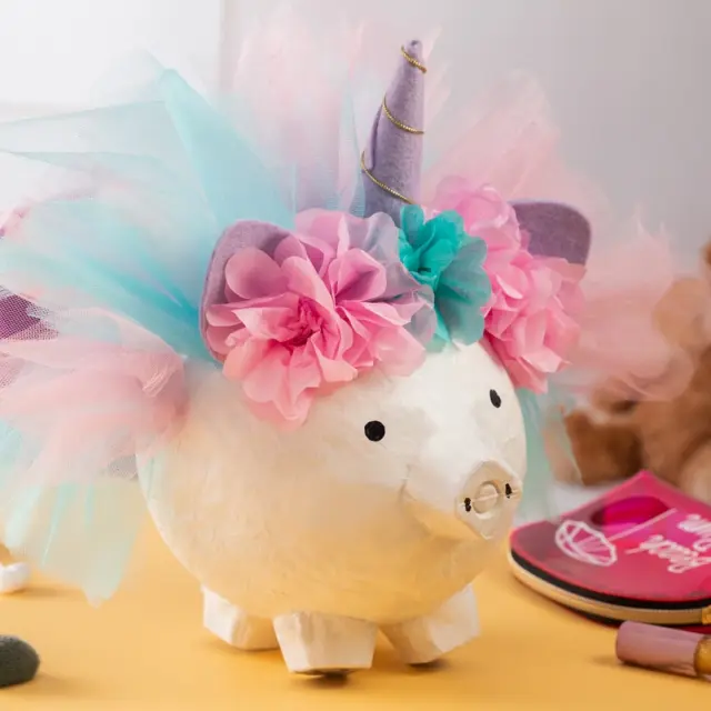 Comenzar los ahorros será más divertido con esta alcancía hecha con un globo, periódico y engrudo. Esta alcancía no es el típico puerquito, pues va adornada con colores y lleva un cuerno de unicornio, para que nunca te olvides de echar tus monedas al final del día.